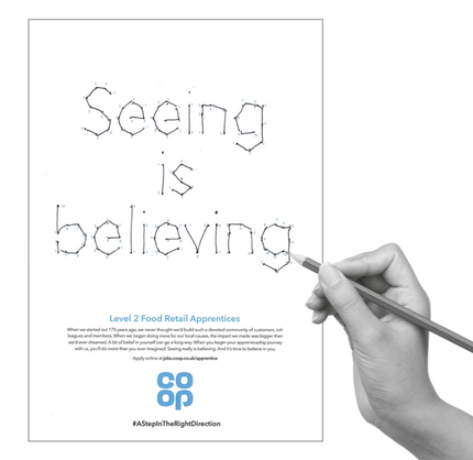 One of the projects I've worked on for Co-op was for their Apprentices campaign. This campaign was called 'a step in the right direction' and was split into several audiences: internal colleagues, career starters, returners to work, careers changers and veterans. To cater to these audiences my teams and I created mock ups of posters, viral ideas and people stories.